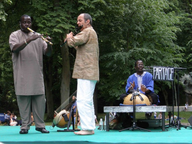 nous arrivons à Paris et sommes accueillis à la gare, de là nous partons vers Saint Cloud. Il fait beau, très bonne nouvelle car le festival a lieu en plein air. A peine arrivés nous attaquons les balances, j’ai encore des soucis avec mon pédalier, j’espère que ça va aller. Nous revenons à la Conservation, le bâtiment principal pour un rapide repas et filons pour le premier concert. Il fait beau soleil et si c’est bien pour le festival, cela l’est moins pour mon ordinateur qui ventile beaucoup. J’ai toujours des problèmes de pédalier et nous allons changer l’ordre du concert pour jouer principalement les morceaux sans Logelloop, j’aurai le temps de m’en occuper après ce concert. Tout se passera bien et le public et les organisateurs ont l’air contents de la musique de Serendou. Pendant le concert suivant, je vais m’atteler à la réparation du pédalier avec les tournevis de Eric et David. Ce n’est pas bien grave et je le reconnecte facilement à l’ordinateur. Je vais pouvoir profiter des concerts des Azéris et des Kazakh, merveilleux.